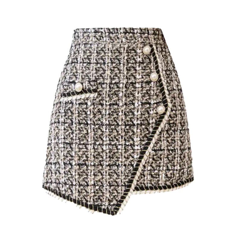 I love this stylish mini skirt which has a flattering feminine cut and buttons to the side for easy on. I love it teamed with a beige corset.