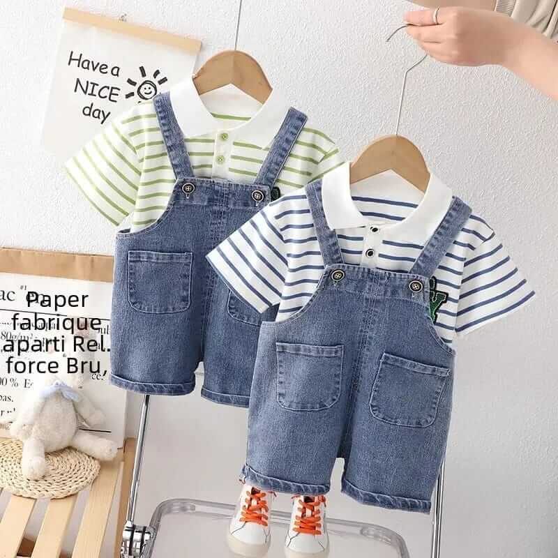 Short sleeve strap set boys and girls summer cotton t-shirt and denim suspender shorts.