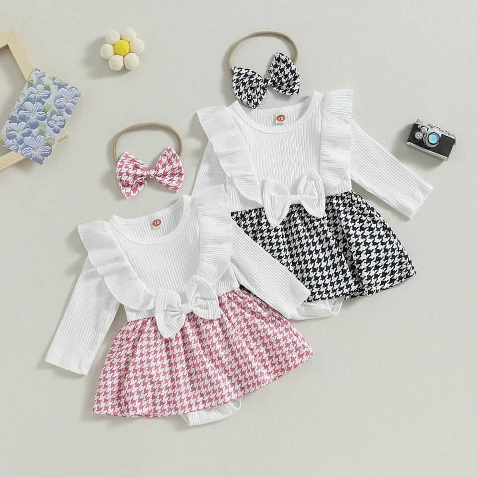Infant girl romper dress long sleeve rib knit houndstooth skirt with headband.