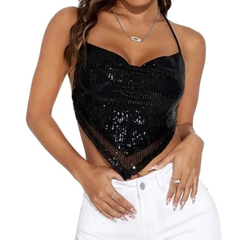 Sexy sleeveless v shaped shiny crop top.